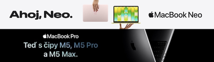- úplně nový MacBook Neo s odolným hliníkovým pláštěm, úchvatným 13palcovým Liquid Retina displejem, výkonným čipem Apple a celodenní výdrží baterie – to všechno za cenu, kterou byste u Apple nečekali- MacBook Pro/Max s čipy M5 Pro a M5 Max se supervýkonem na nejnáročnější profesionální činnosti